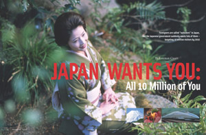"Years ago, nobody understood what 'Aloha' meant either," he replies, insisting 'Yokoso' will one day be as much a part of the English lexicon as Hawaii's famous all-purpose greeting. Perhaps, but who has time to wait that long? Japan excels at exporting SUVs, flat-screen TVs and video games, but has always fumbled when it comes to selling itself. By international standards Japan's tourism budget is skimpy and not a little bit sad. But still, after years of neglect, tourism is now nearing the heart of the Japanese economy. With so many riches and so much to offer, Japan is finally sensing the need to get the word out. Its new focus on tourism is long overdue. @