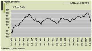Now, why is this plausible? Well, look at the graph for investment as a share of GNI and witness how it actually rose towards the end of the 1980s and peaked with the bubble 1989-1991. Clearly, Japan got a strong accumulated boost from external demand throughout the 1980s which helped keep national savings high even though domestic investment rates fell. But was Japan dependent on this in terms of creating growth? This seems dubious in that investment rose sharply during the end of the 1980s and thus we can say that, all things equal, Japan had the the domestic conditions to create a sound investment boom/bust bubble.