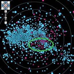 After the query is submitted, SO-TI’s server farm performs the search and analysis, and within a few seconds the searcher’s Web browser shows relationships as a radar chart, with the original search term in the center. Patents with similar content are arranged in positions around the original, with their distance from the center indicating their similarity to the original, and the angle at which they are displayed also indicates the nature of the content (this is, patents with content similar to each other will be displayed at the same “o’clock” relative to the original). As well as these angular and radial dimensions, the map provides two other visual metrics. The first is color —the names of the holders of the mapped patents are given to the right of the map, and clicking on these names highlights the holders’ patents on the map, with a different color assigned to each holder. Lastly, the size of the markers on the map can indicate “patent clusters” of very similar patents.